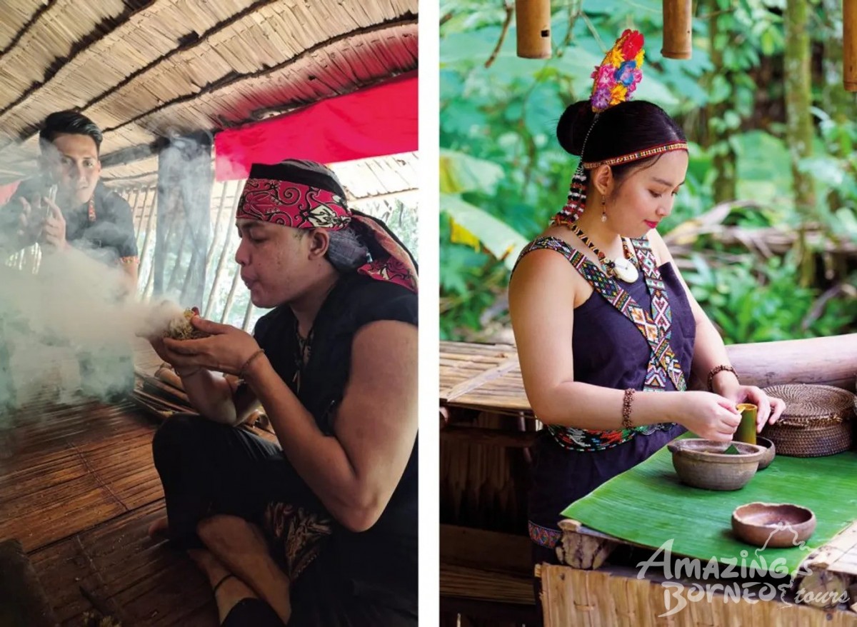 Fire-starting class in Mari Mari Cultural Village, photo by Megan Sullivan (left) and a Rungus woman prepares honey at Mari Mari Village.