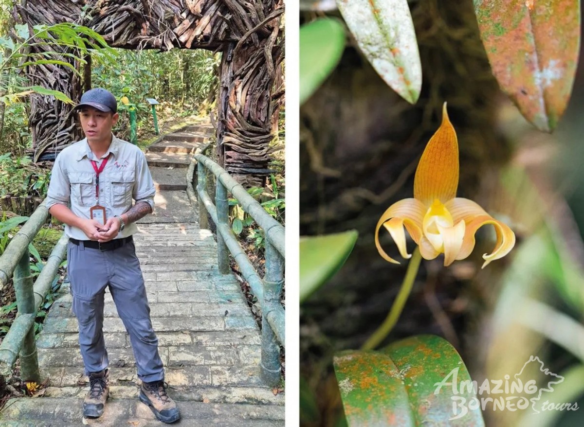 Guide Joel from Amazing Borneo, in the botanical gardens (left) and a small Orchid on Mount Kinabalu (right).