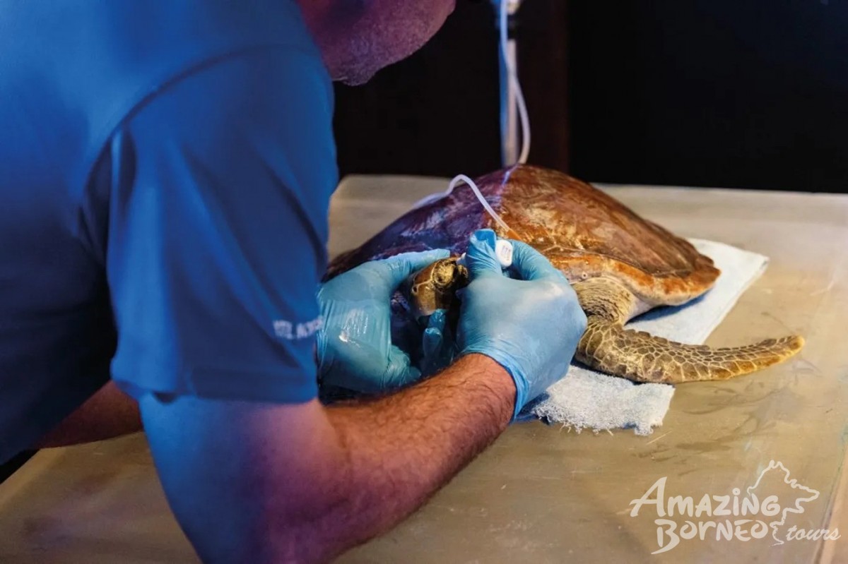 A rescued turtle receives eye drops at Gaya Island Resort Marine Centre.