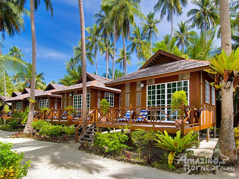 Accommodation is made from native materials of Borneo on Twin Share Basis. The resort have total 45 wooden chalets, which comprises of 18 standard chalets (Semi-Detached size 14 x 12ft), 22 standalone chalets (Detached Chalet size 19 x 16ft mostly twin-bedded) and 2 units suite chalet (Size 28 x 23ft), which could accomodate 84 guests at any one time. All the chalets made from native materials of Borneo on Twin Share Basis, built with mosquito screens have attached toilet/bathroom with hot shower facilities and the comfort of air-conditioning, which are available for 24 hours. Electrical outlet is 220 Volt AC, 50 cycles using three rectangular prongs similar to British plugs. Electricity supply 24 hours a day.