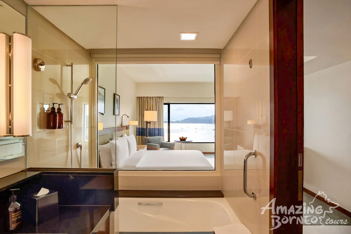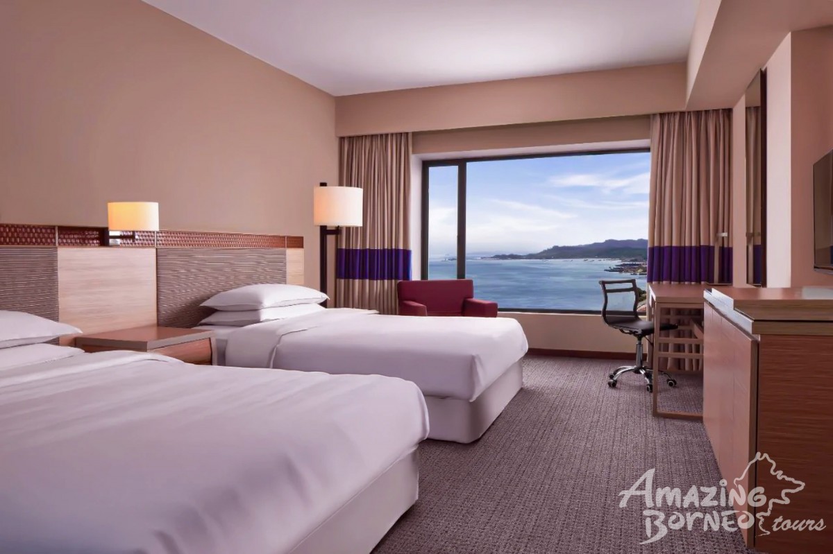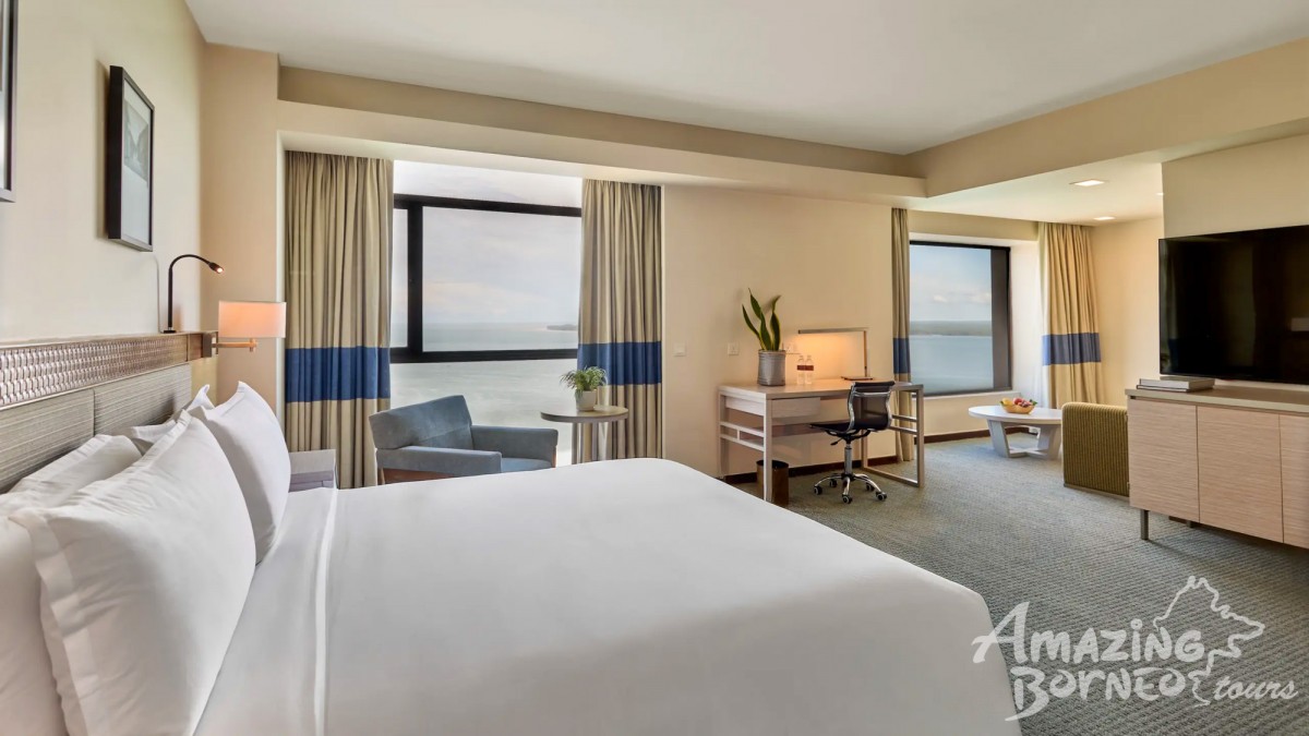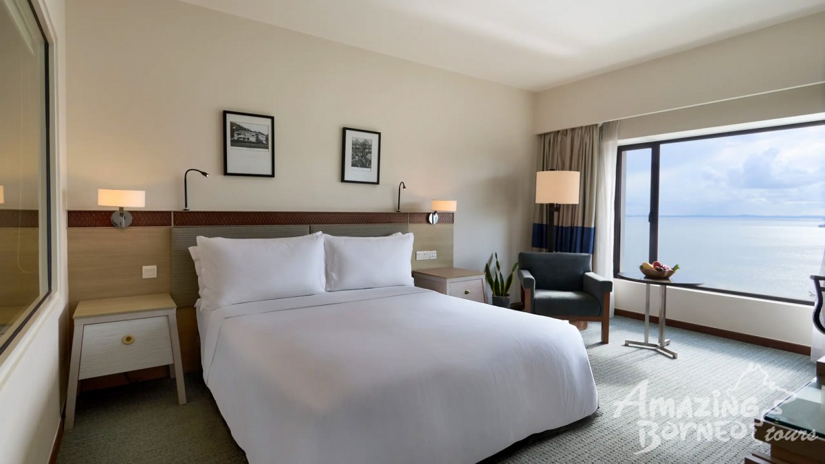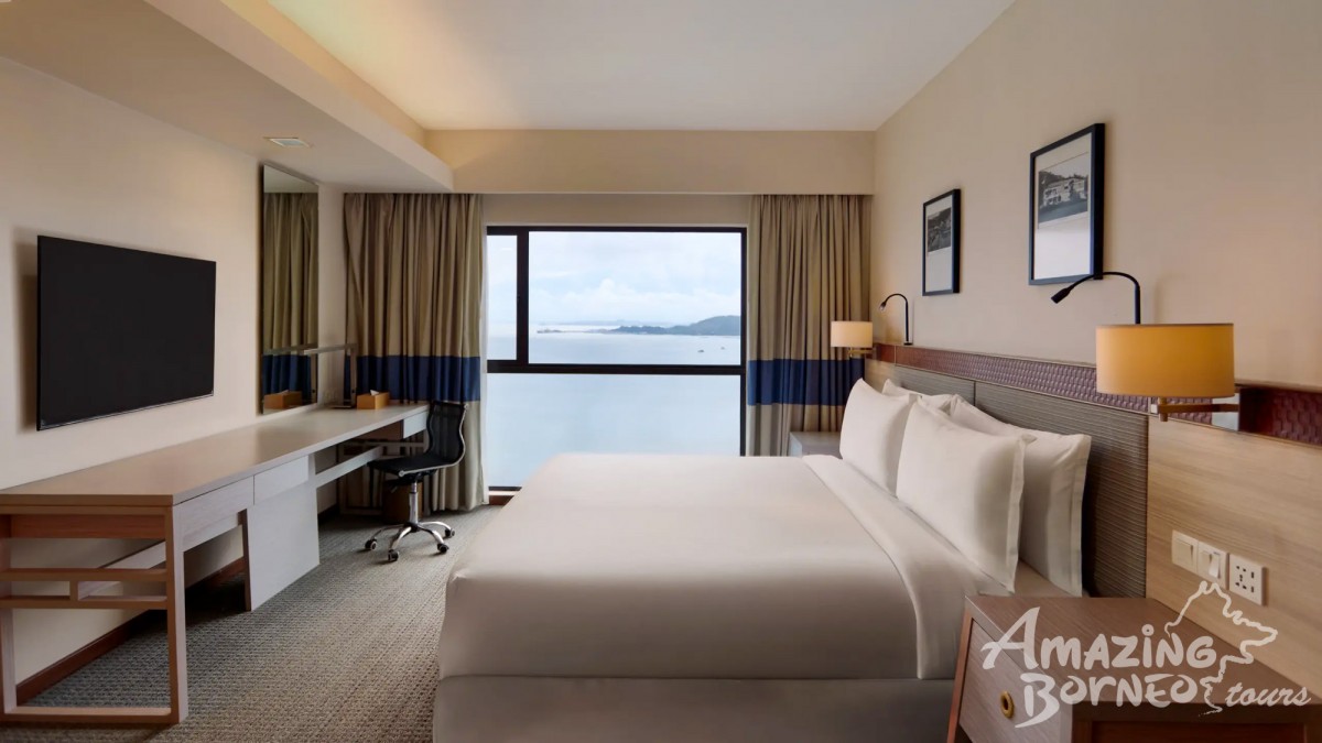 This room offers a king-size bed or twin beds with views of the Sandakan coastline. It includes a work desk, high-speed WiFi, and a modern bathroom with a walk-in shower, ideal for a relaxing stay by the waterfront.